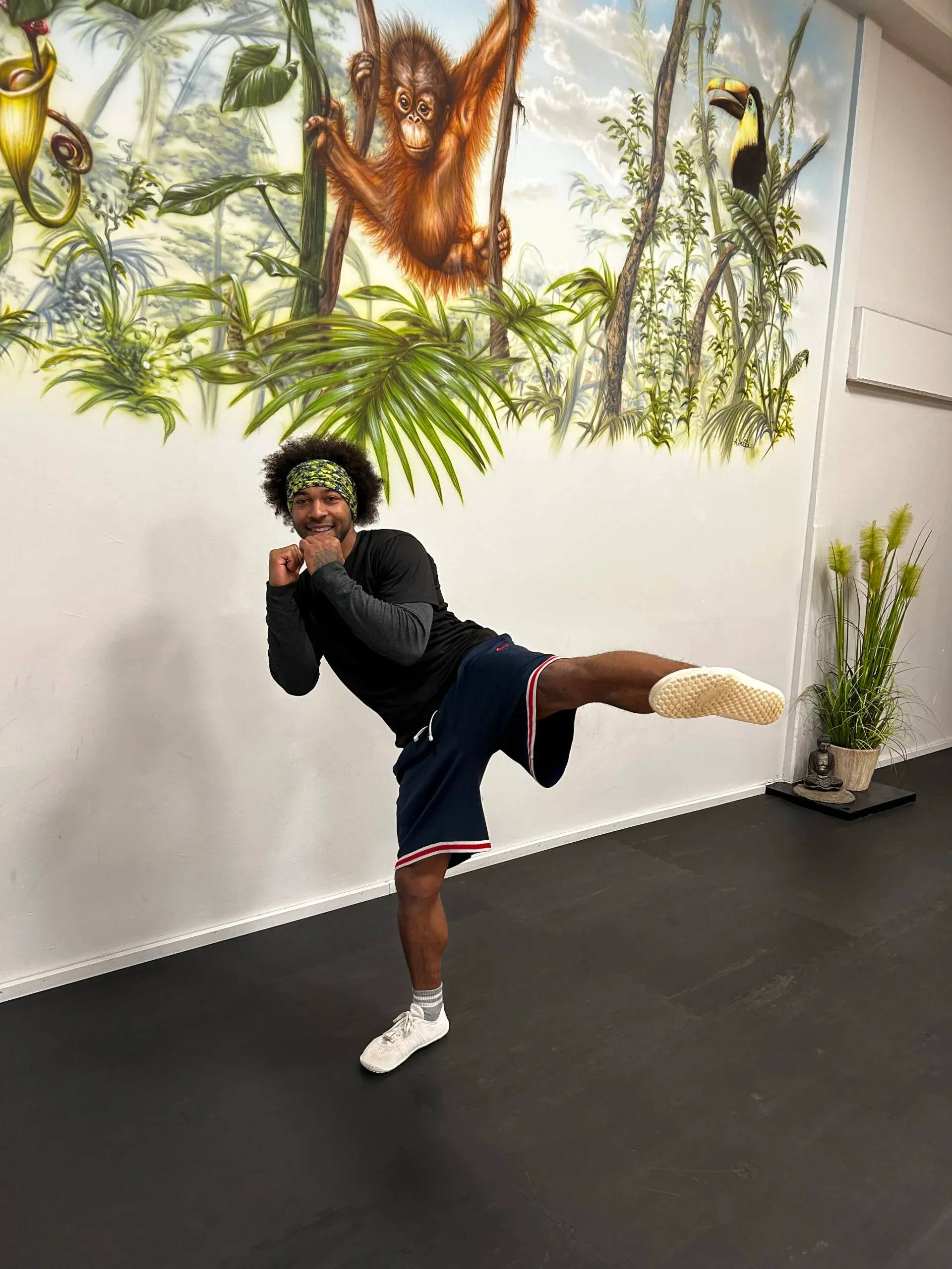 Pratzen) und Bodyweight-Übungen trainiert. Der Fokus liegt auf präziser Technik, Ganzkörpertraining